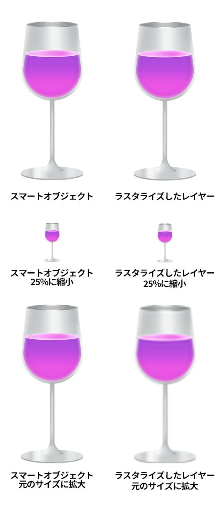 スマートオブジェクトとラスタライズしたレイヤー、それぞれの画像を25%に縮小したのちに、元サイズまで拡大してみます。