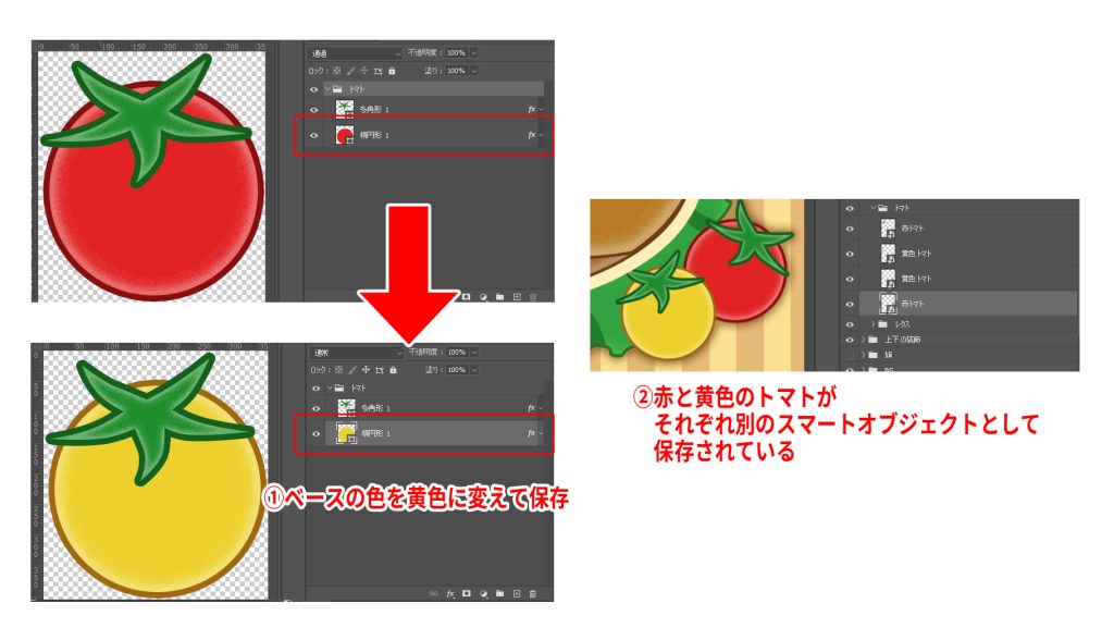 青線で囲まれた方のスマートオブジェクトを開き、トマトの赤い部分の色を黄色に変更します。スマートオブジェクトのウィンドウを選択した状態で上書き保存をすると、ピンクの線で囲ったトマトには反映されず、青線で囲ったトマトだけを色変えすることが出来ました。
