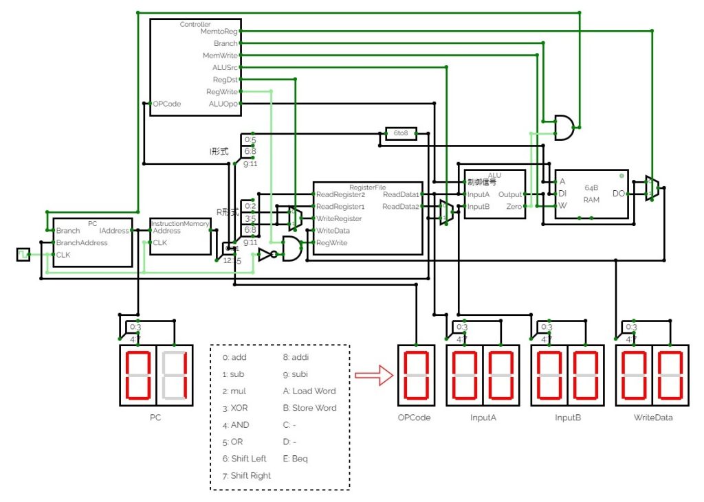 無駄に高機能な割に割り算ができないという歪な構成ですが、除算器を実装するのは面倒なので許してください。命令に空きがあるので、興味の有る方は実装してみても面白いかもしれません。