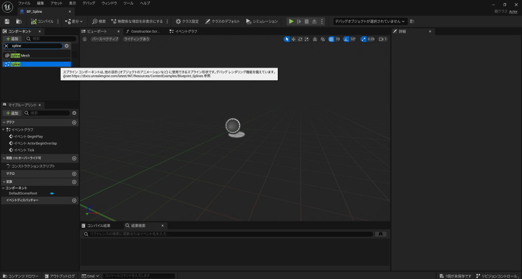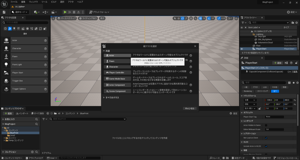 “右クリック>ブループリントクラス>Actor”からBP_Splineを作ります。