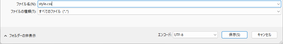 こちらもhtmlファイルと同様にテキストファイルを新規作成して開き、「名前を付けて保存」から「全てのファイル」を選び、「style.css」にしましょう。
