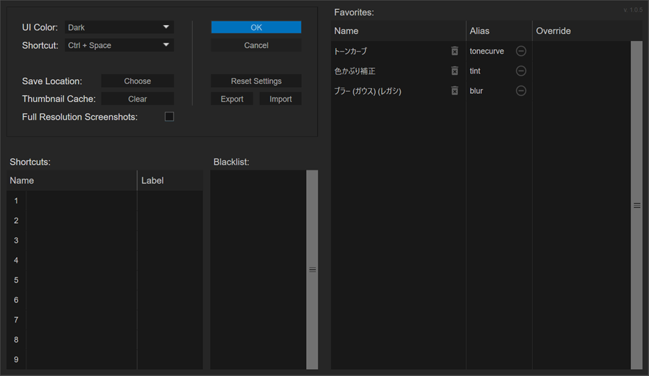 この問題は、お気に入り(Favorites)機能によってある程度解消できます。検索窓の歯車を押すと表示される設定画面で、あらかじめエフェクトを登録しておき、別名(Alias)を半角英数で設定しておくことで、日本語入力を介さずに検索をすることができます(上の画像では、「トーンカーブ」エフェクトに ”tonecurve”、「色かぶり補正」に ”tint”、「ブラー(ガウス)(レガシ)」に ”blur” の別名を設定しています)。