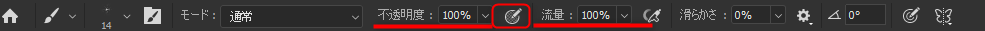 消すときにきれいに消えづらくなるので、ブラシの不透明度、流量は100%にしてください。