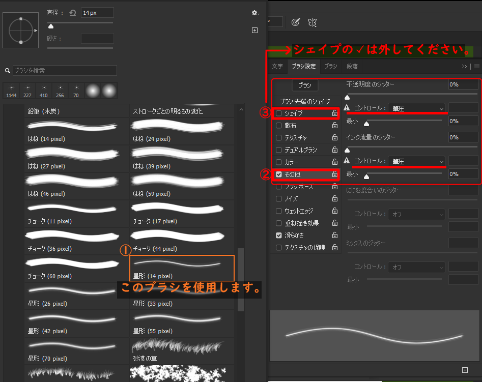 このその他の筆圧で変化する不透明度を利用して描くので、シェイプの筆圧にチェックを入れない方がいいかもしれないです。(③参考)