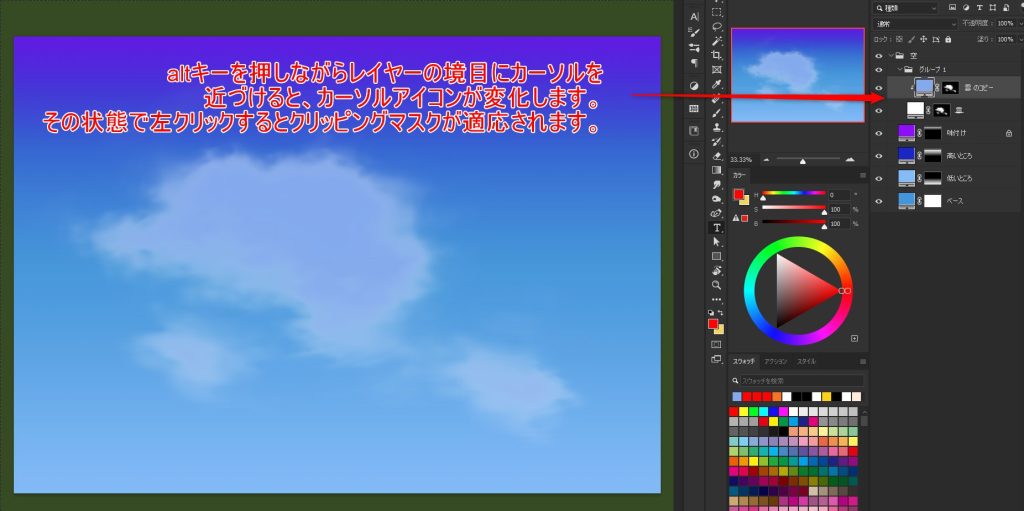 雲を描画したレイヤーを複製し、影っぽい色にした後、クリッピングマスクにします。