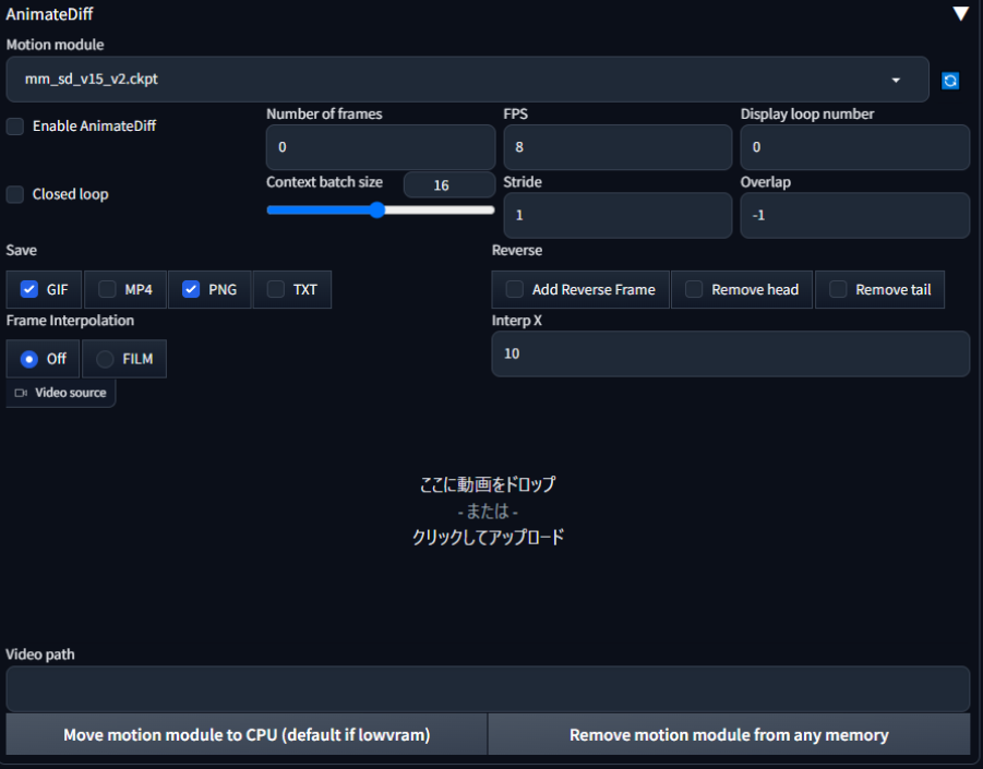 実際にStableDiffusionからAnimateDiffを開くとこんな感じになっています。