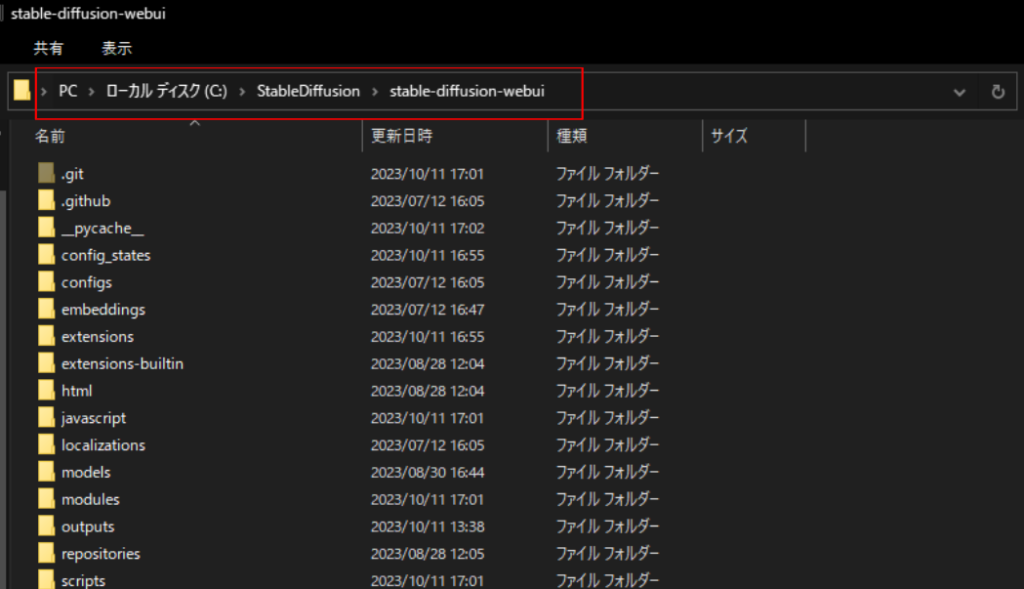 ダウンロードが完了したら、エクスプローラーから「stable-diffusion-webui」が保存されているファイルを開きます。