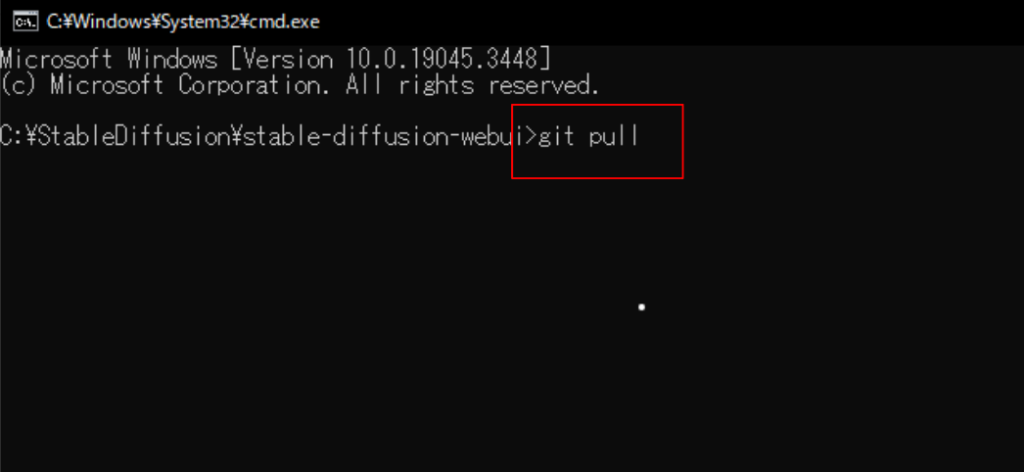 ②コマンドプロンプトに「git pull」と入力し、エンターを押すと、最新のバージョンがインストールされます。