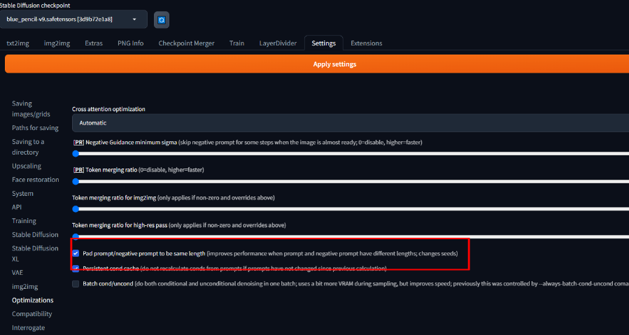 また、「Settings」→「Optmizations」→「Pad prompt/negative prompt to be same length(improves performance when prompt and negative prompt have different lengths; changes seeds)」を有効に変更しました。