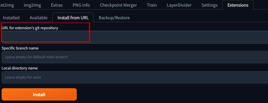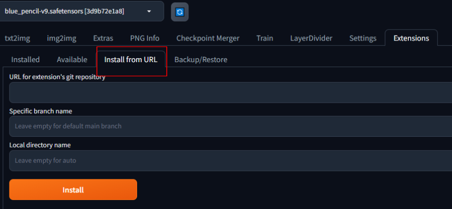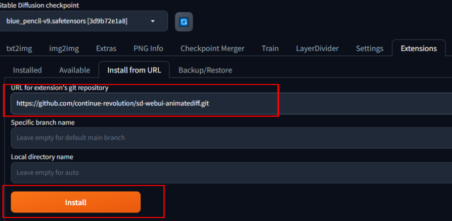 「Install from URl」のタブが開いたら、「URL for ectension’s git repository」欄にAnimateDiffのリポジトリを追加します。