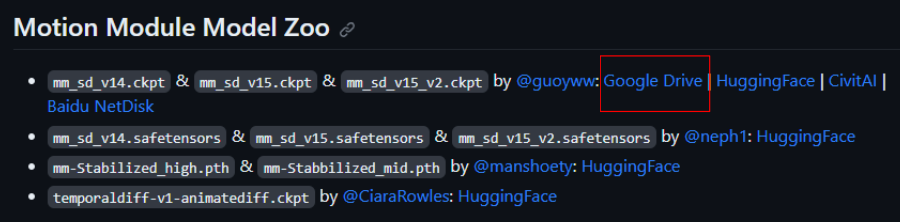 先ほどと同じgithubサイトから「Motion Module Model Zoo」という項目へ移動します。