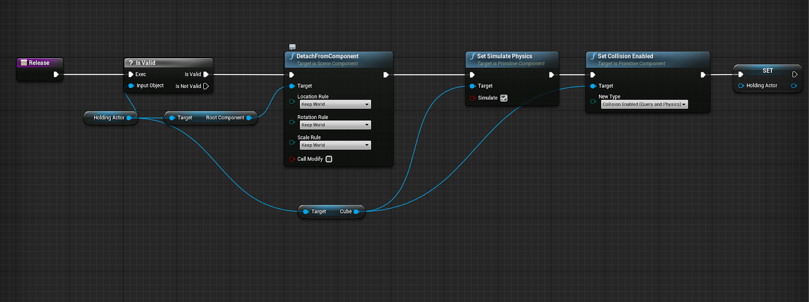- Release関数では、現在PickUpActorを持っているかを検証し、持っていればDetachFromComponentによって離します。離した後、SetSimulatePhysicsやSetCollisionEnabledによって物理やCollisionを再度有効化します。最後に、プレイヤーが持っているPickUpActorを示す変数”HoldingActor”にNullをSetします。