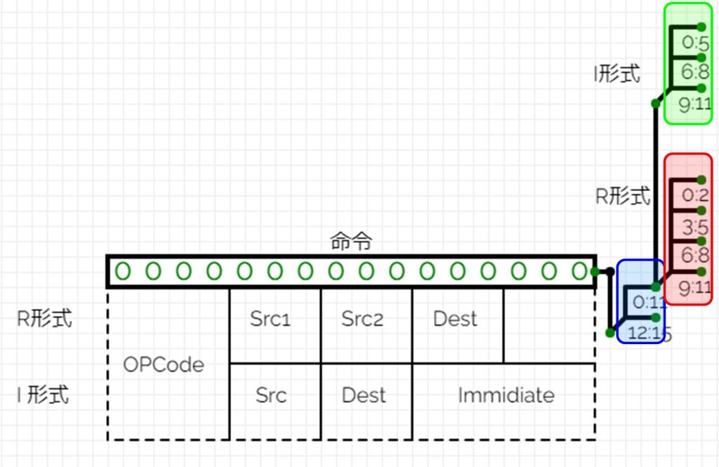 まずは上図のように、各命令ごとにSplitterをつかってビットを分割しました。根本の青部分で、16bitの命令を上位4bitのOPCode(命令種別コード)とそれ以外に分け、のこり12ビットをそれぞれI形式(緑)、R形式(赤)用に分割しています。
