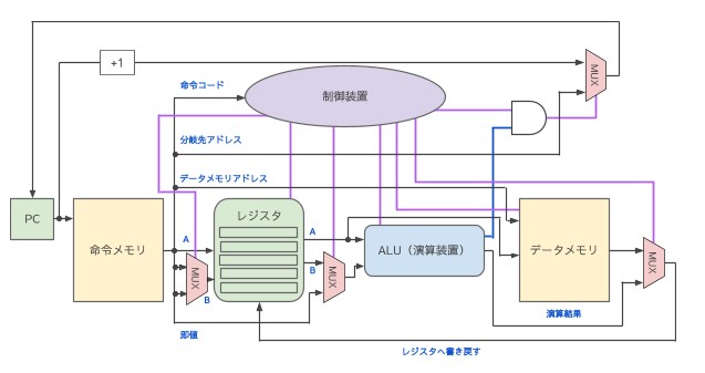 beqという分岐命令を実装するために、ANDゲートが追加されています。これは、「2つのソースレジスタの値が同値であり、かつ実行命令が beq であるときに分岐フラグを立てる」ことを意味します。