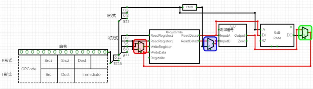 宛先レジスタ(Dest 3bit)は、どこのレジスタアドレスにデータを格納するか指定する信号なので、RegisterFileのWriteRegisterに対応します。R形式とI形式で位置が異なるため、マルチプレクサ(赤)をおいて場合ごとに切り替えます。